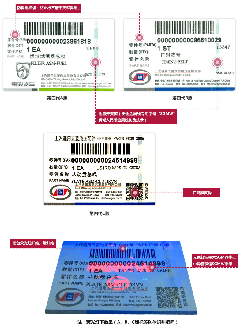 上汽通用五菱自2005年以來已更新過4代純正配件的防偽標(biāo)簽,以下是目前主要使用的第3、4代純正配件防偽標(biāo)簽,供廣大用戶識(shí)別: